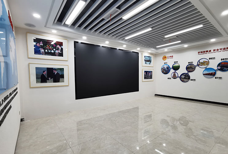企業(yè)展廳結(jié)合正大集團(tuán)文化設(shè)計(jì),在展廳廣告設(shè)計(jì)中采用地圖、展板廣告以及亞克力烤漆立體字等工藝。
