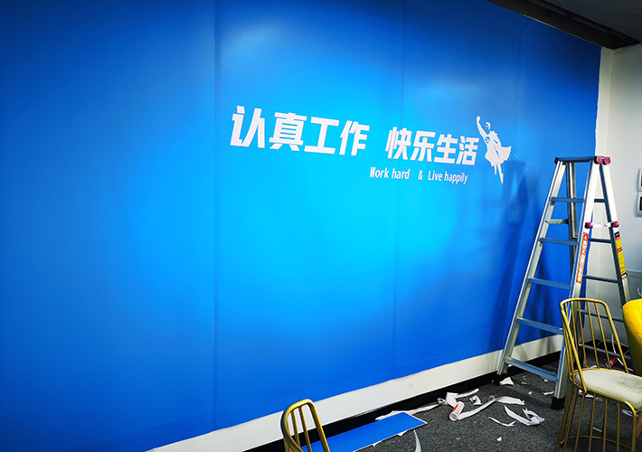 公司文化墻整面改色以及廣告布置方案,整體PVC背膠車,可以以最便捷的方式達(dá)到效果。